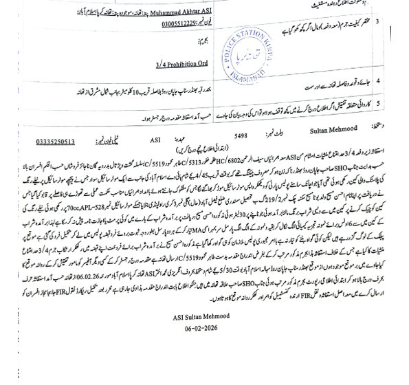 ASI محمد اختر ہمراہ پولیس نفری ڈیوٹی پر موجود تھے کہ دورانِ گشت ایک مشتبہ شخص کو روکا گیا۔ پولیس نے ضابطے کے مطابق جب مشتبہ شخص کی تلاشی لی تو اس کے قبضے سے ممنوعہ اشیاء، جن میں شراب / نشہ آور مشروبات شامل ہیں، برآمد ہوئیں۔ برآمد شدہ اشیاء کو موقع پر ہی قبضہ پولیس میں لے کر مالِ مقدمہ قرار دے دیا گیا۔